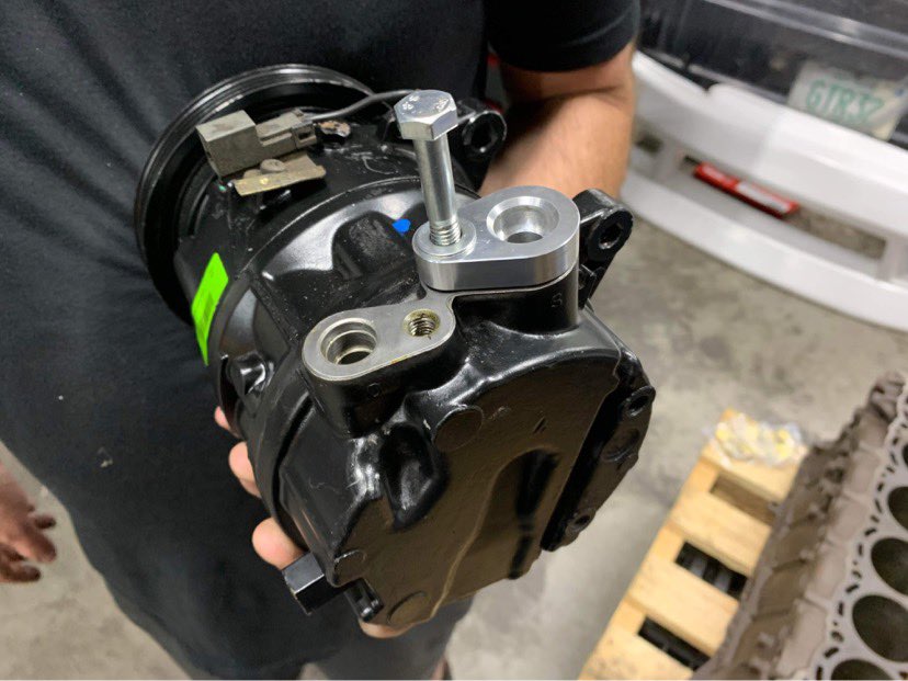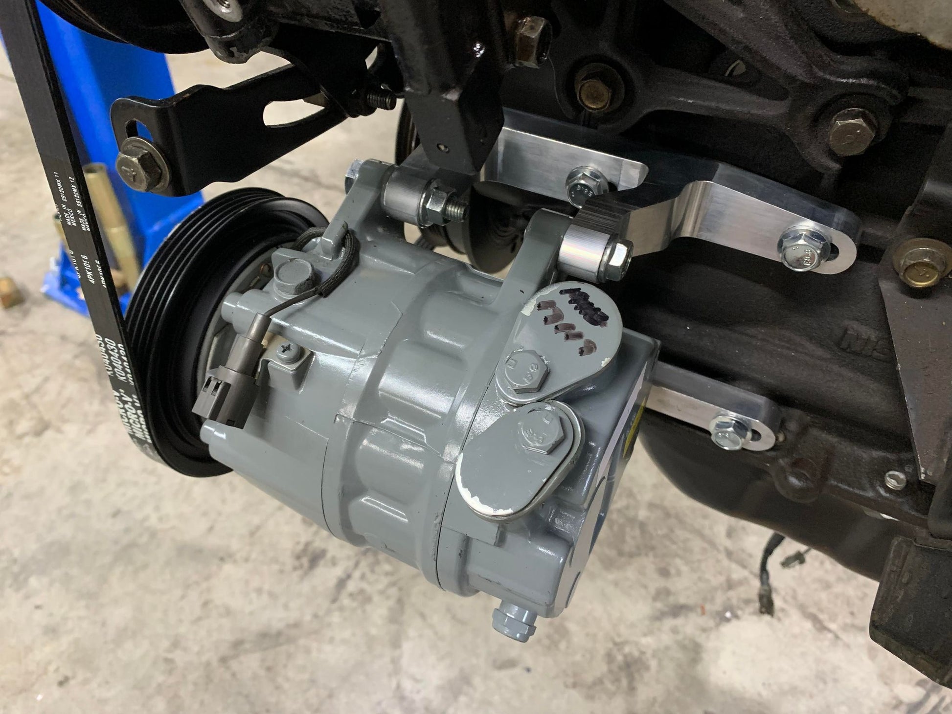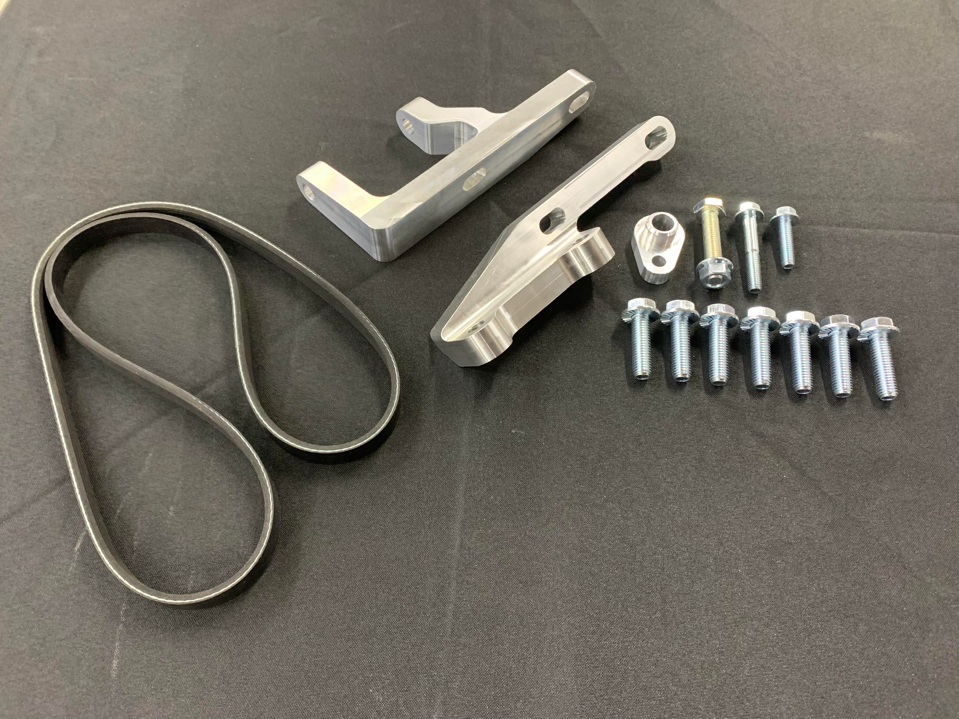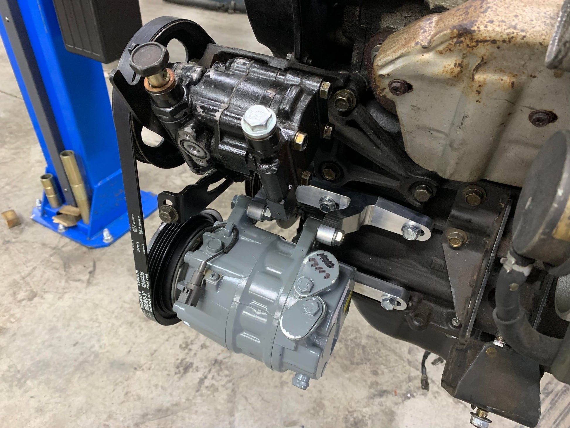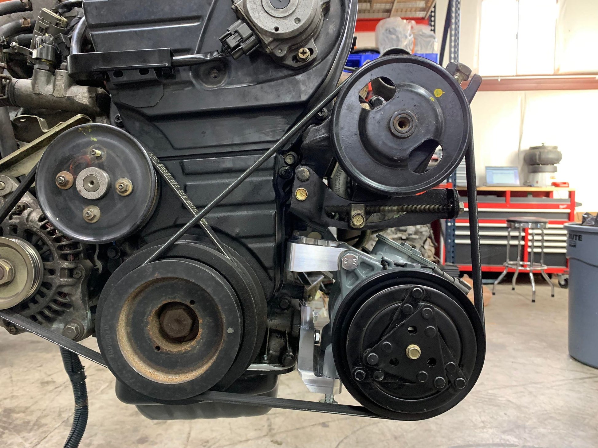 2) Moves the compressor forward allowing it to share the same belt as the power steering pump. No more throwing belts in high rpm and limiter. You will now tension the AC belt along with the power steering using it's tensioner. Also allows for more turbo kit clearance in some cases.
