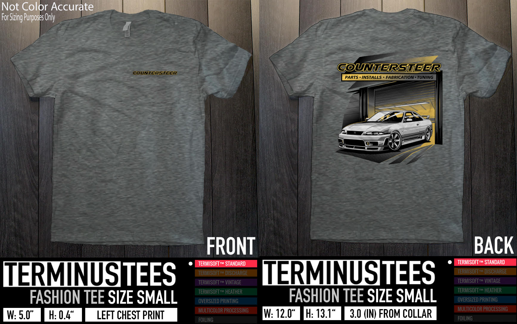 Support your Skyline shop with one of our new R33 tee shirts! These are a blend of mostly polyester and some cotton meaning they don't shrink much and they are durable! They're a fitted design so keep that in mind when choosing a size. Available in gray or black.